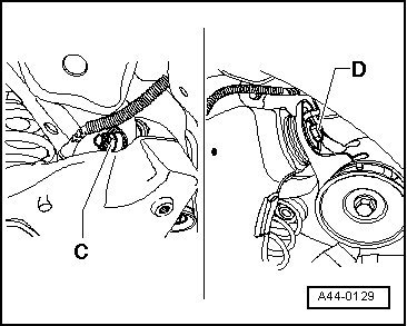 - Remove front interior trapezoidal control arm/subframe connection nut - C -.