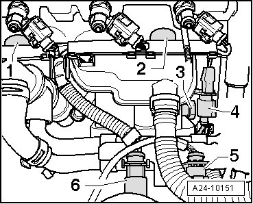 • The intake manifold runner position sensor (G336 ) must be adapted to the engine control module ( J623) using diagnosis and service system (VAS 5052) after removing or replacing the fuel rail.
