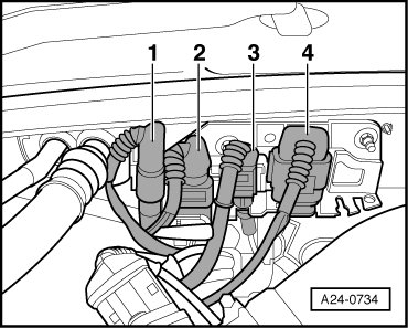 1 - 4-pin connector for Oxygen Sensor (O2S) 2 Behind Three Way Catalytic Converter -G131- and Oxygen Sensor (O2S) Heater 2 -Z30-, bank 2