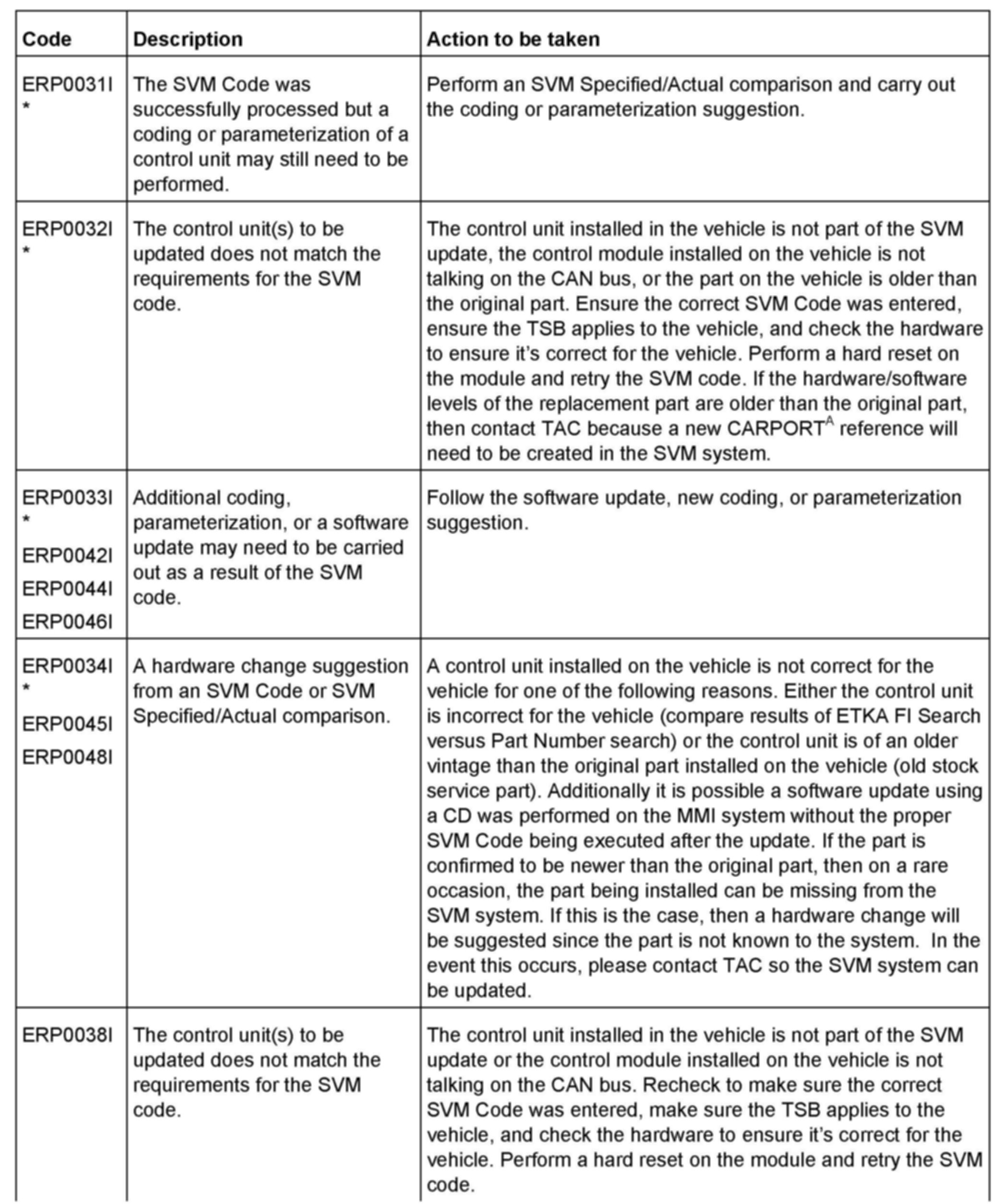 2. Update the instrument cluster (J285) using the SVM action code as listed in the table below if necessary.