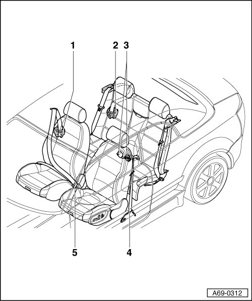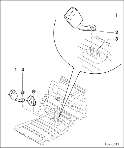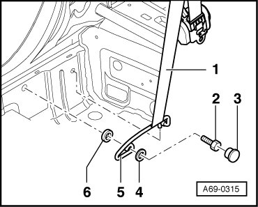 - Remove the belt webbing - 1 - from the bracket - 5 -.