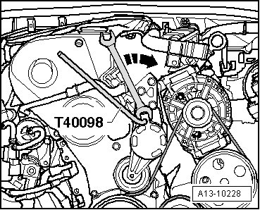 - Relieve ribbed belt tension by turning tensioner in direction of - arrow - and lock in place using locking pin (T40098 ).