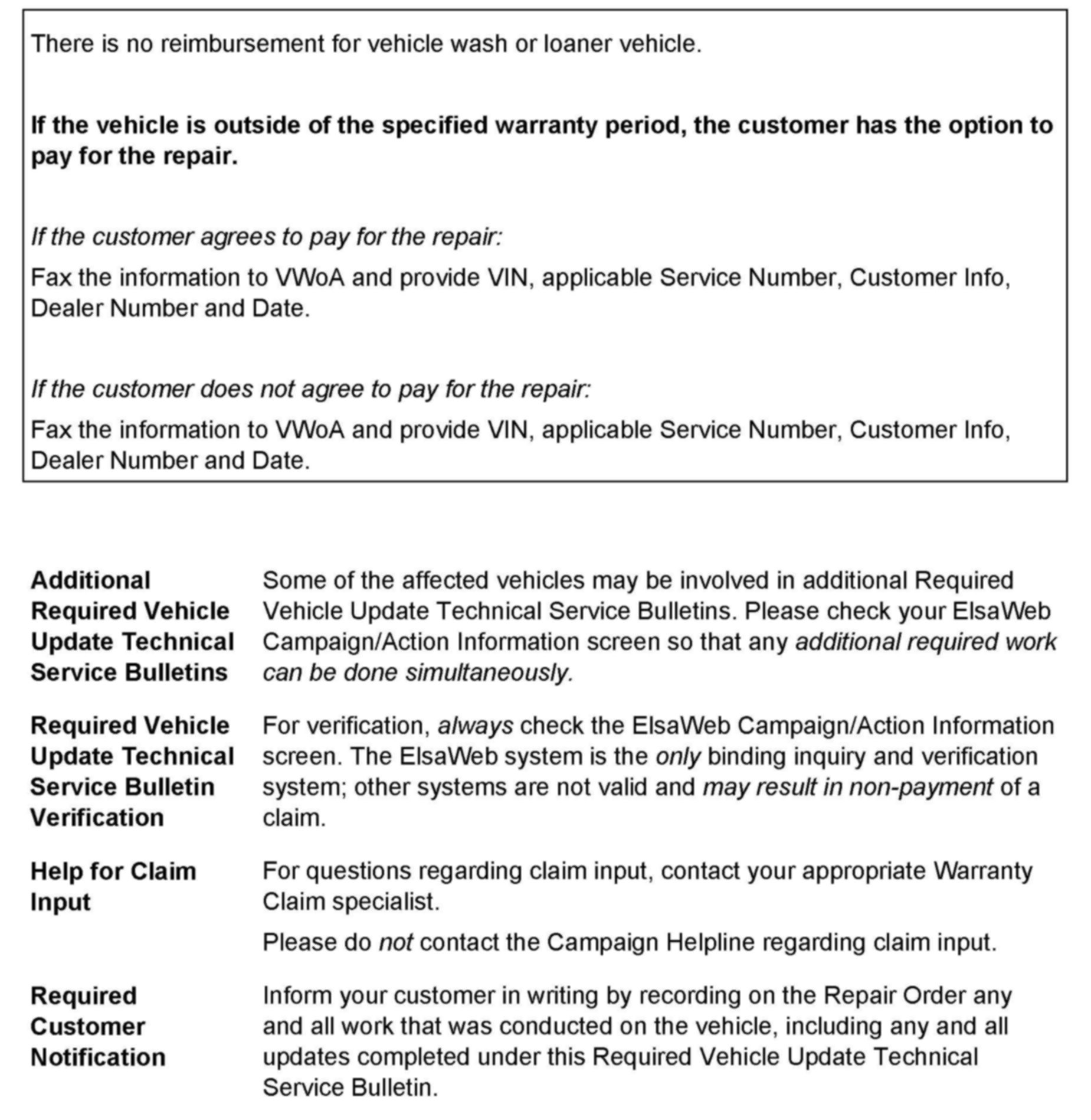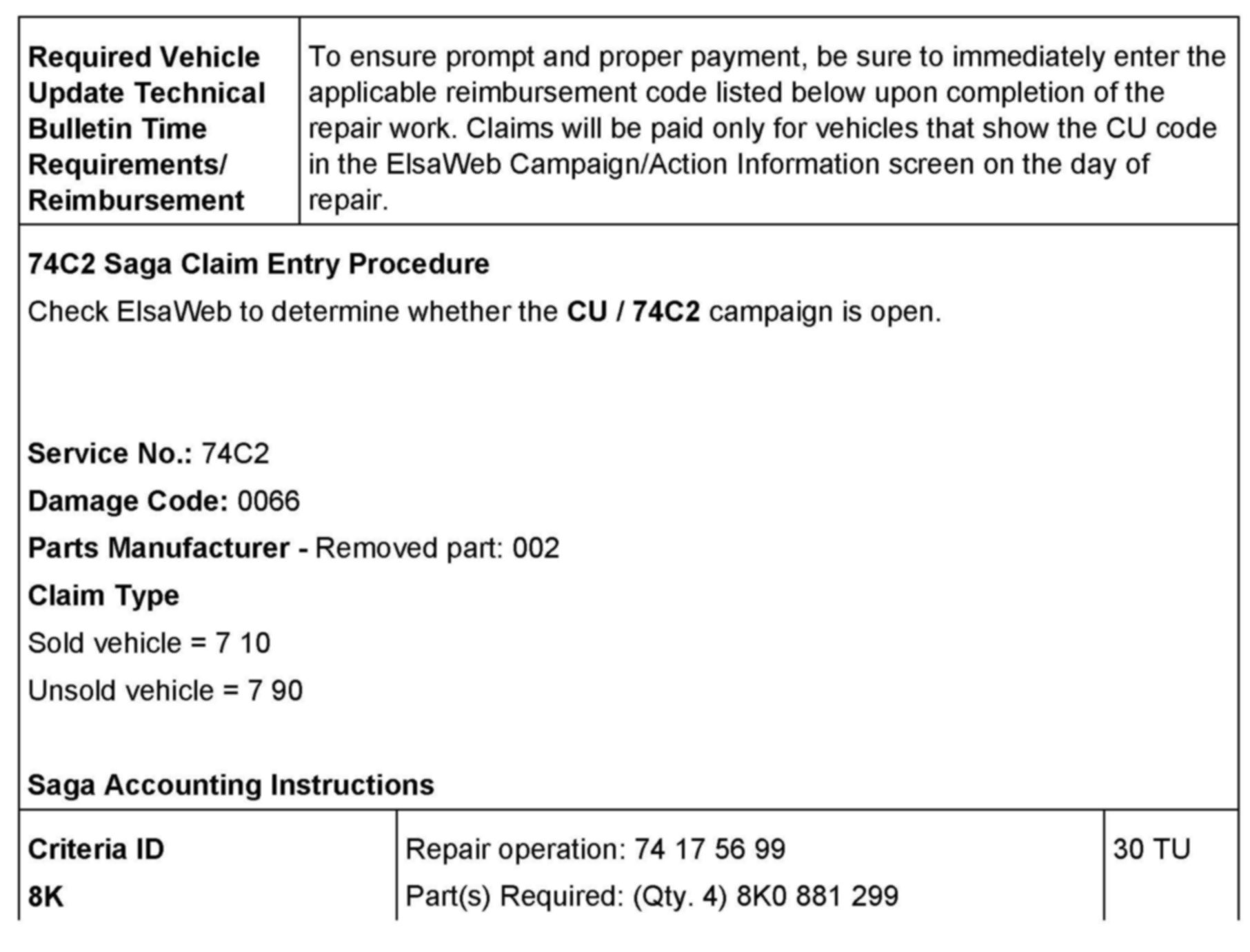 ^ If you have exhausted your allocated parts and you require additional parts for vehicles affected by this RVU but have exceeded your Upper Order Limit, please submit your request for additional parts via email. be sure to include the affected VINs with your order. Prior to submitting your request, ensure that each vehicle has the CU / 74C2 code open in ElsaWeb. Your order will be reviewed and processed accordingly.