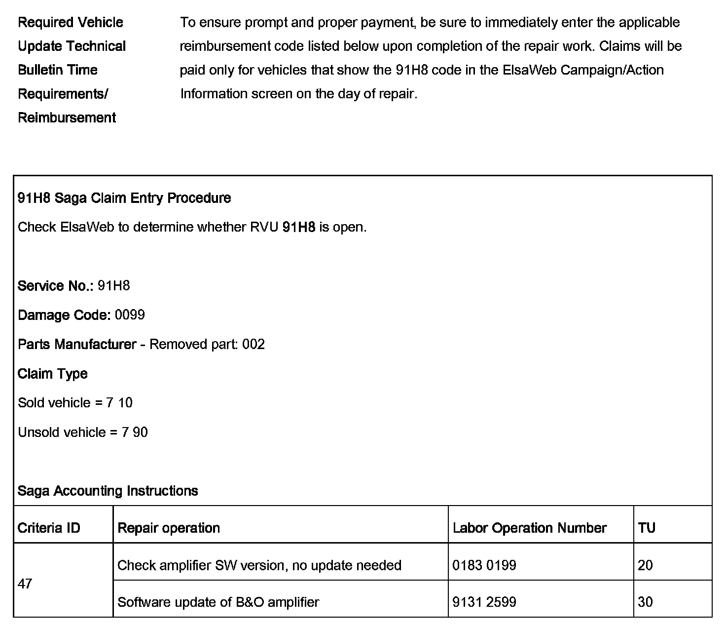 ^ Procedure is valid only for vehicles that show the 91 H8 code in the ElsaWeb Campaign/Action Information screen on the day of repair.