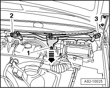 - Remove bolts - arrows - and detach entire wiper frame - 1 -.