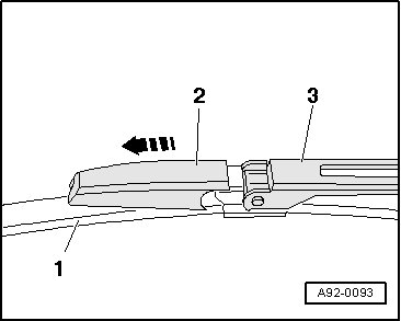 - Insert joint piece of wiper arm into guide on wiper blade - arrow 1 -; make sure that the joint piece is inserted completely into guide.