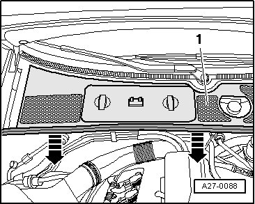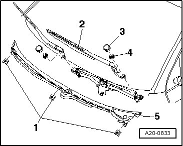 - Pull off securing clips - 1 - and remove cowl panel grill - 5 -.