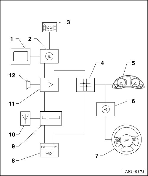 8 Radio (R) with Speech Input Control Module (J507) behind left luggage compartment side trim