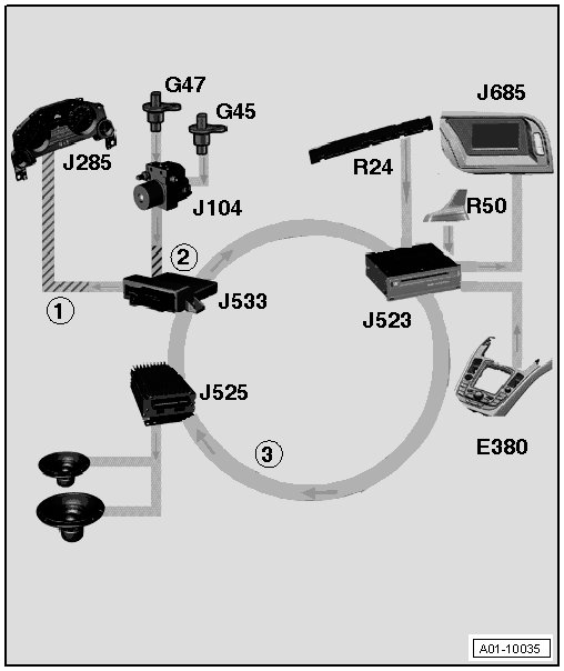 The navigation system has many control modules which are interlinked with the individual vehicle systems. These control modules communicate with each other via the different bus versions. The data bus on board diagnostic interface (J533), which is connected to all the different bus versions, processes the data and sends it to the control module.