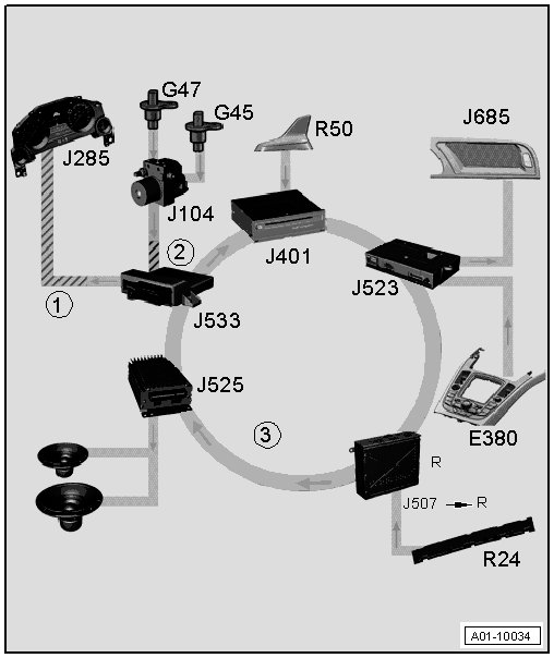 The navigation system has many control modules, which are interlinked with the individual vehicle systems. These control modules communicate with each other via the different bus versions. The data bus on board diagnostic interface (J533), which is connected to all the different bus versions, processes the data and sends it to the control module.