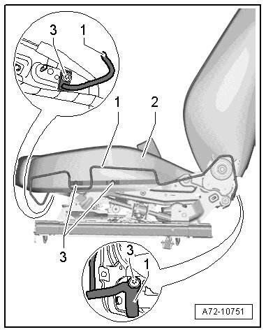 - Remove the bracket - 1 - from the front seat - 2 -. Remove any cable ties from the retaining bracket.