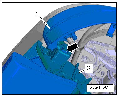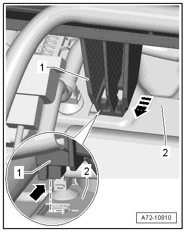 - Release the tab - arrow - on the storage compartment - 2 - and remove the storage compartment downward from the sill-side trim - 1 -.