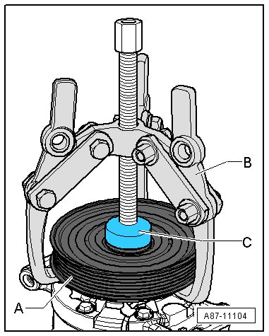 • Use a sleeve - C - (for example, VAG 1719/1 taken from A/C clutch set (V.A.G 1719) ) to support the spindle on the arm puller - B - on the A/C compressor flange.