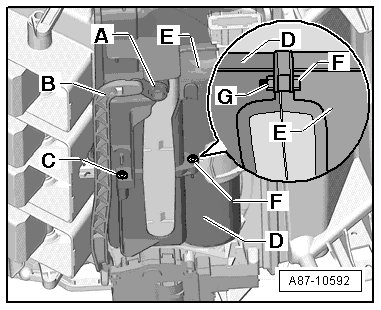 • From 07.2007 through 09.2007 and screw - F - and nut - G - was installed on the left heater core housing - D -. The left heater core housing - D - has a single hole and not a threaded connection. To remove and install the bolt - F - and the nut - G - on this control motor version, the Temperature Regulator Door Motor (V68) or the Rear Temperature Door Motor (V137) must be removed. Refer to => [ Temperature Regulator Door Motor (V68) and Rear Temperature Door Motor (V137) ] Temperature Regulator Door Motor (V68) and Rear Temperature Door Motor (V137).