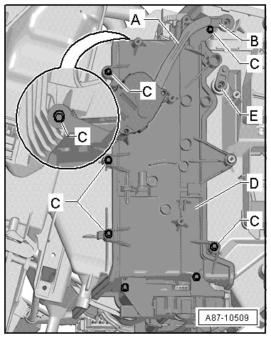 • At the start of production, A/C units were installed, where the left and right side of the heater core housing - D - and - E - were bolted together on the underside with the bolt - C -. Beginning 07.2007 as a running change, A/C units are being installed, where both heater core housings - D - and - E - are bolted together with the bolt - F -.