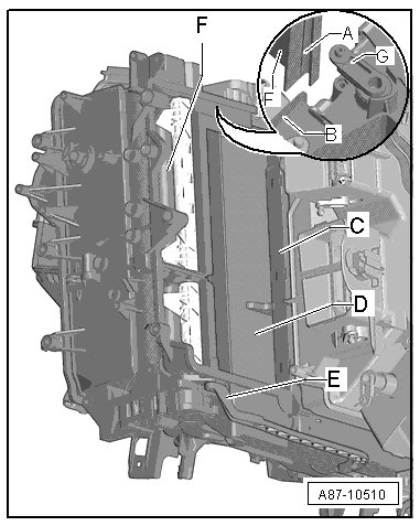 - Insert the grooves - A - on the left heater core housing - F - into the springs on the A/C unit - B - and push the left heater core housing - F - into the A/C unit.