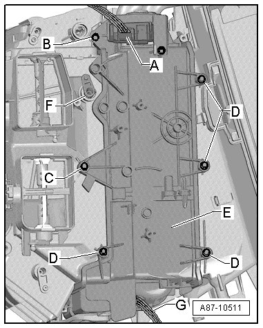 - On vehicles equipped with an auxiliary air heater heating element (Z35) loosen the cables - G - from the right heater core housing - E -. Refer to => [ Auxiliary Air Heater Heating Element (Z35)/Honey Comb ] Service and Repair.