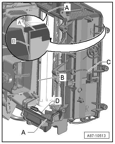 • If the groove - A - on the right heater core housing - C - or the spring on the A/C unit - B - are damaged, seal these with, for example, Silicone Adhesive D176 001 A3. Refer to Electronic Parts Catalog (ETKA).