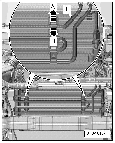 - Unlock the retaining clamps - arrow A - and move the power steering cooling coil - 1 - forward - arrow B -.
