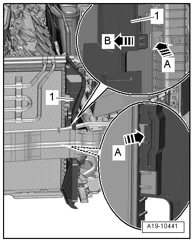 - Unlock the retaining straps - arrows A - (each two straps, one on top and one below on the air guide) and move the left and right air guide - 1 - toward the center of the vehicle - arrow B -.