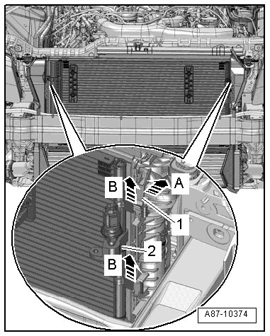 - Unlock the retaining clamps - 1 - in - arrow direction A - and remove the condenser - 2 - upward and out of the brackets on the radiator - arrows B -.