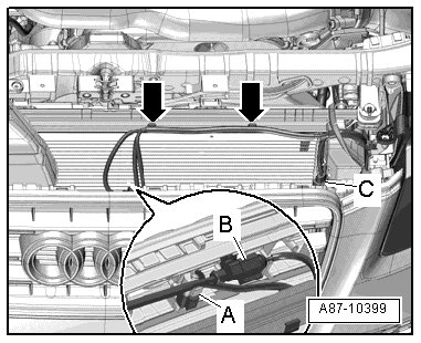 - Disconnect the electrical connector - B - leading to the sensors for the front park assist and the electrical connector for the Outside Air Temperature Sensor (G17) - Pos. A -.