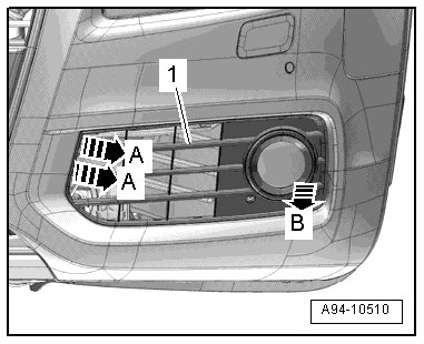 - Unlock the retainers - arrows A - and remove the left air intake grille - 1 - from the bumper cover - arrow B -.