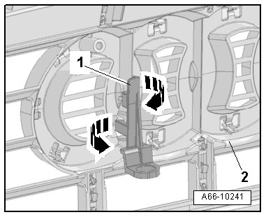 - Release the clips - arrows - and remove the bracket - 1 - from the radiator grille - 2 -.