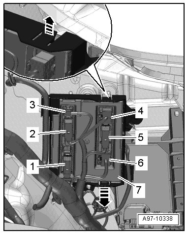 - Release the retaining clips - arrows - and remove the comfort system central control module (J393) - item 7 - from the retaining frame.