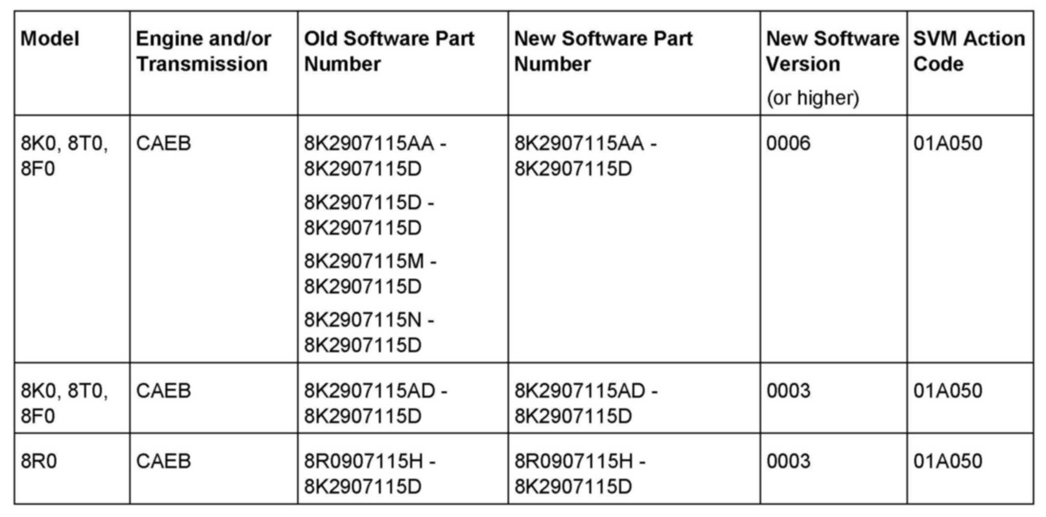 Service software update with SVM code 01A050.
