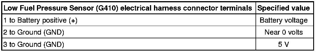 - Using a multimeter, check the Low Fuel Pressure Sensor (G410) electrical harness connector for voltage.