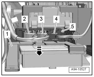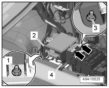 - Release the retaining clip - arrow - and remove the parking aid control module (J446) - item 5 - from the retaining frame - 1 -.