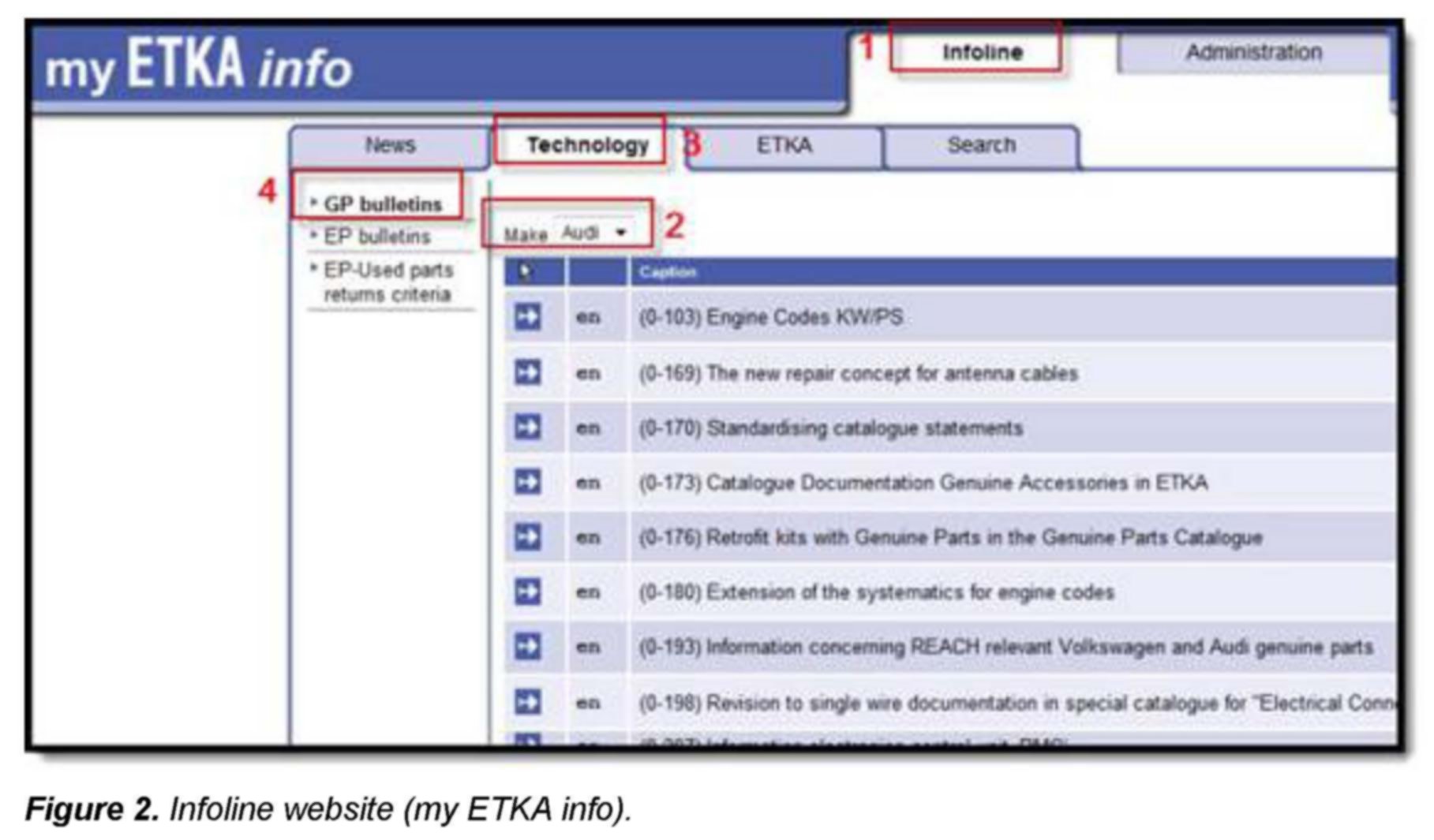 Once the icon is selected, the ETKAinfo.com website will be automatically opened. Next the user must select the tab labeled "Infoline", then set the Make to "Audi" in the dropdown menu, then select the tab labeled "Technology", and then select the left menu option labeled "GP bulletins" (Figure 2).