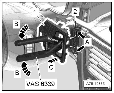 - Hold the (VAS 6339) pressed with one hand and remove the trim - 1 - with the other hand - arrow C -.