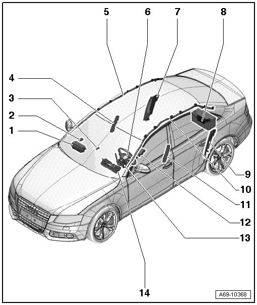 • Assembly overview: Sedan, refer to => [ Head Curtain Airbag Overview ] Head Curtain Airbag Overview; Avant, refer to => [ Head Curtain Airbag Overview ] Head Curtain Airbag Overview