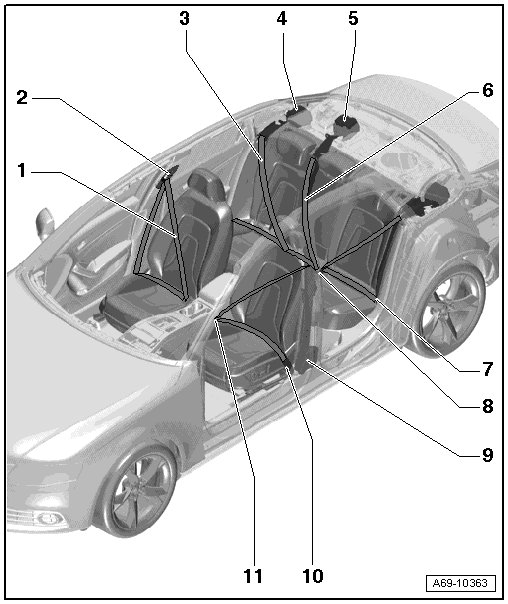 • Front passenger side: with front passenger seat belt tensioner igniter 1 (N154) and front passenger belt force limiter (G552)
