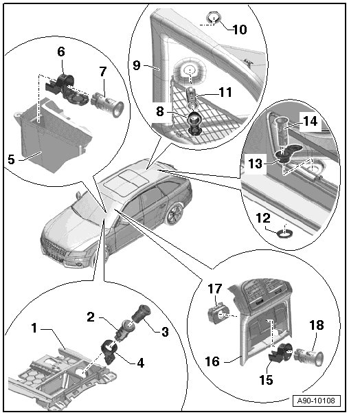 • Removing and installing, refer to => [ Socket Illumination Bulb, 12 V Socket 2 ] Socket Illumination Bulb, 12 V Socket 2.