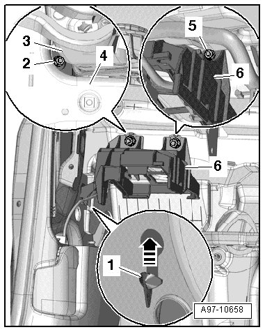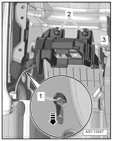- Engage the retaining pins - 1 - on the mount - 3 - at the side guide in the A-pillar - arrow -.