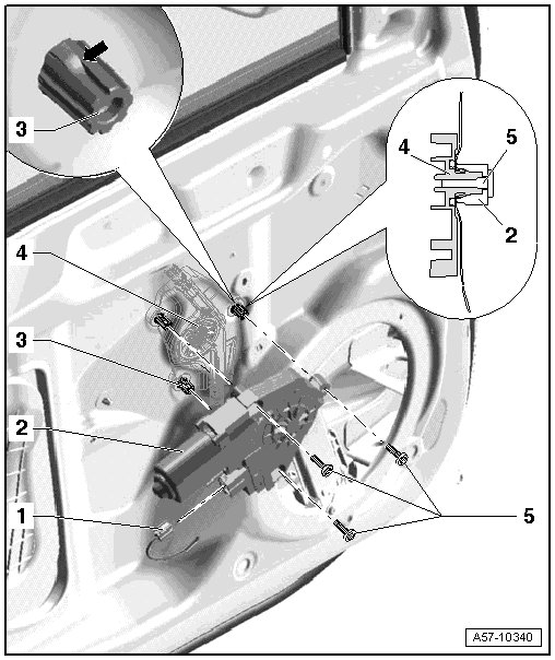 - Remove the screws - 6 - and remove the window regulator motor from the window regulator.