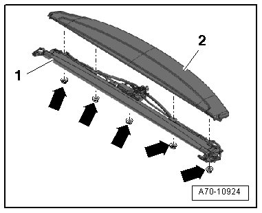 - If removed, install the rear of the rear shelf - 2 - on the sun shade - 1 - - arrows -, aligning both parts to each other.