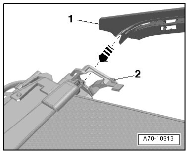 - Carefully install the guide strip - 1 - into the sunroof shade connector - arrow -.
