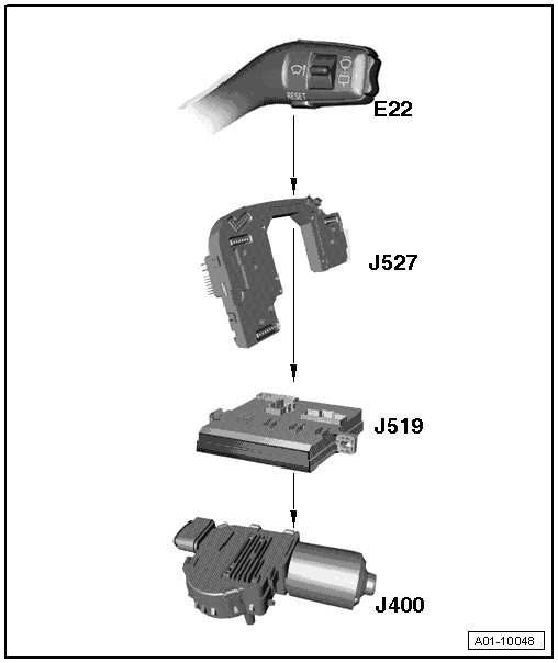 The steering column electronic systems control module the windshield wiping information to the vehicle electrical system control module via the CAN-bus Comfort. The vehicle electrical system control module (master control module) sends the information to the windshield wiper motor control module (LIN slave control module). The windshield wiper motor control module then starts the wiping action.