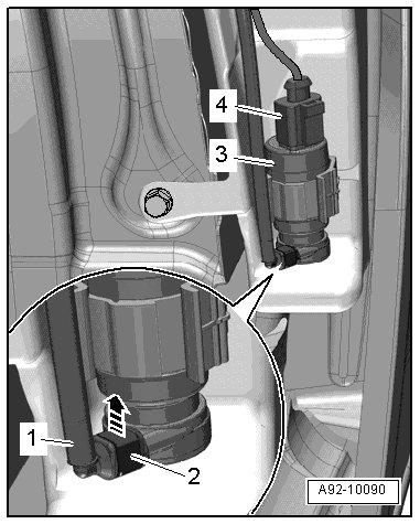 - Remove the windshield washer pump - item 3 - upward out of the washer fluid reservoir.