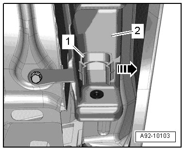 • Press the damaged bracket - 1 - out of the mount in the washer fluid reservoir - 2 - toward the outside of the vehicle - arrow - using a screwdriver.