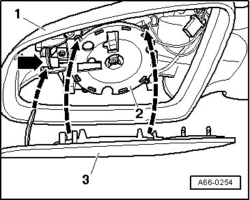 - Install mirror lens - 3 - with locking tabs onto mirror lens base - 2 - in direction of - arrow -.