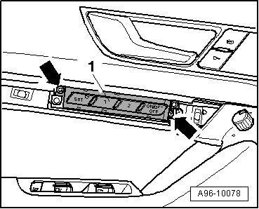 - Carefully remove decorative panel - 1 - from door trim - arrow -.