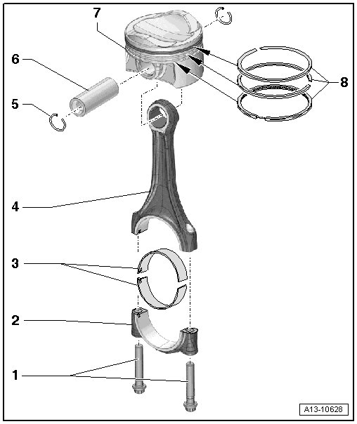 - Mark the connecting rod and connector rod bearing caps to each other and to the cylinder - arrow - with paint for installation.