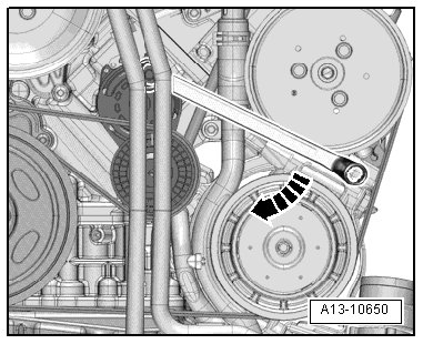 - Pivot the tensioner clockwise - arrow - to release the tension on the ribbed belt.