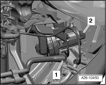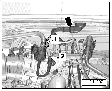 - Disconnect the electrical connector - 1 - on evaporative emission (EVAP) canister purge regulator valve 1 (N80) and disconnect the vacuum hose - 2 - by pressing the release buttons.