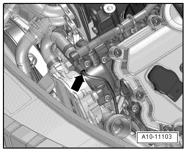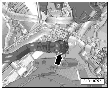 - Remove the coolant hose - arrow - from the front coolant pipe by lifting the retaining clamp.